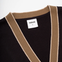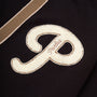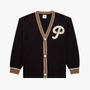 The Letterman Cardy in Black. A V-neck, letterman style Cardigan made from 100% organic cotton. Featuring contrasting trims, button closure and ribbed cuffs. Detailed with a chenille 'P' patch on the chest.