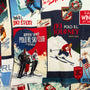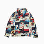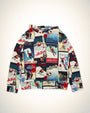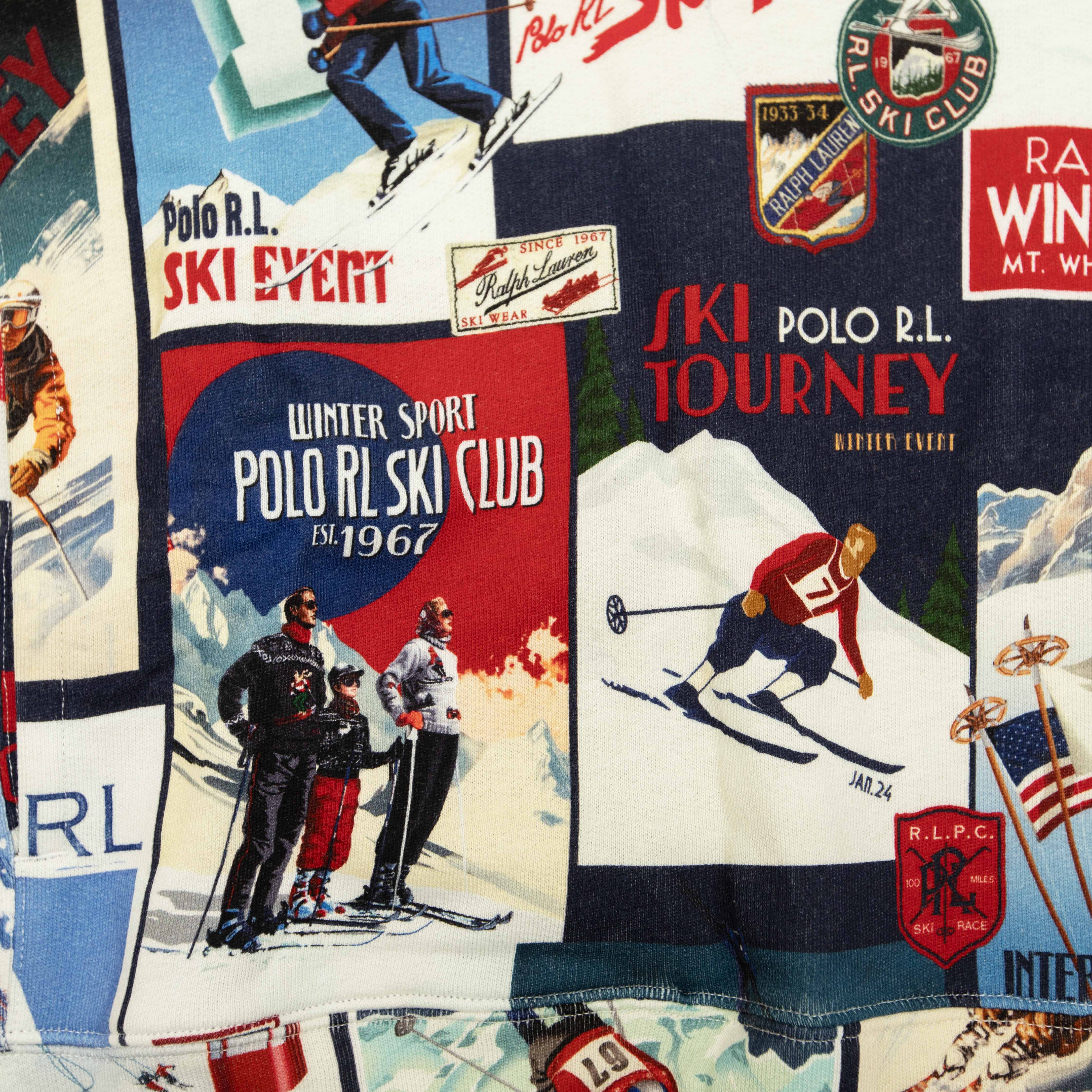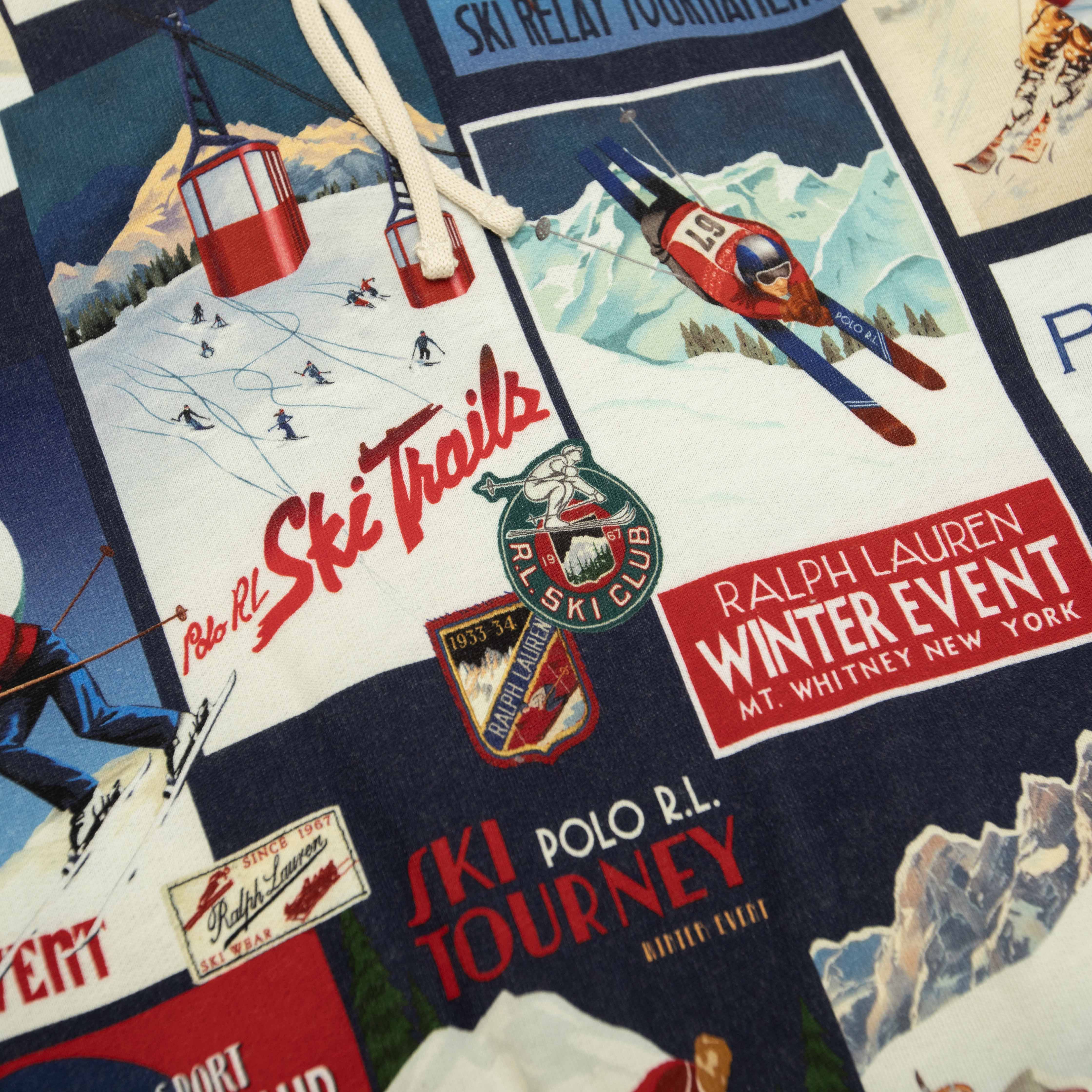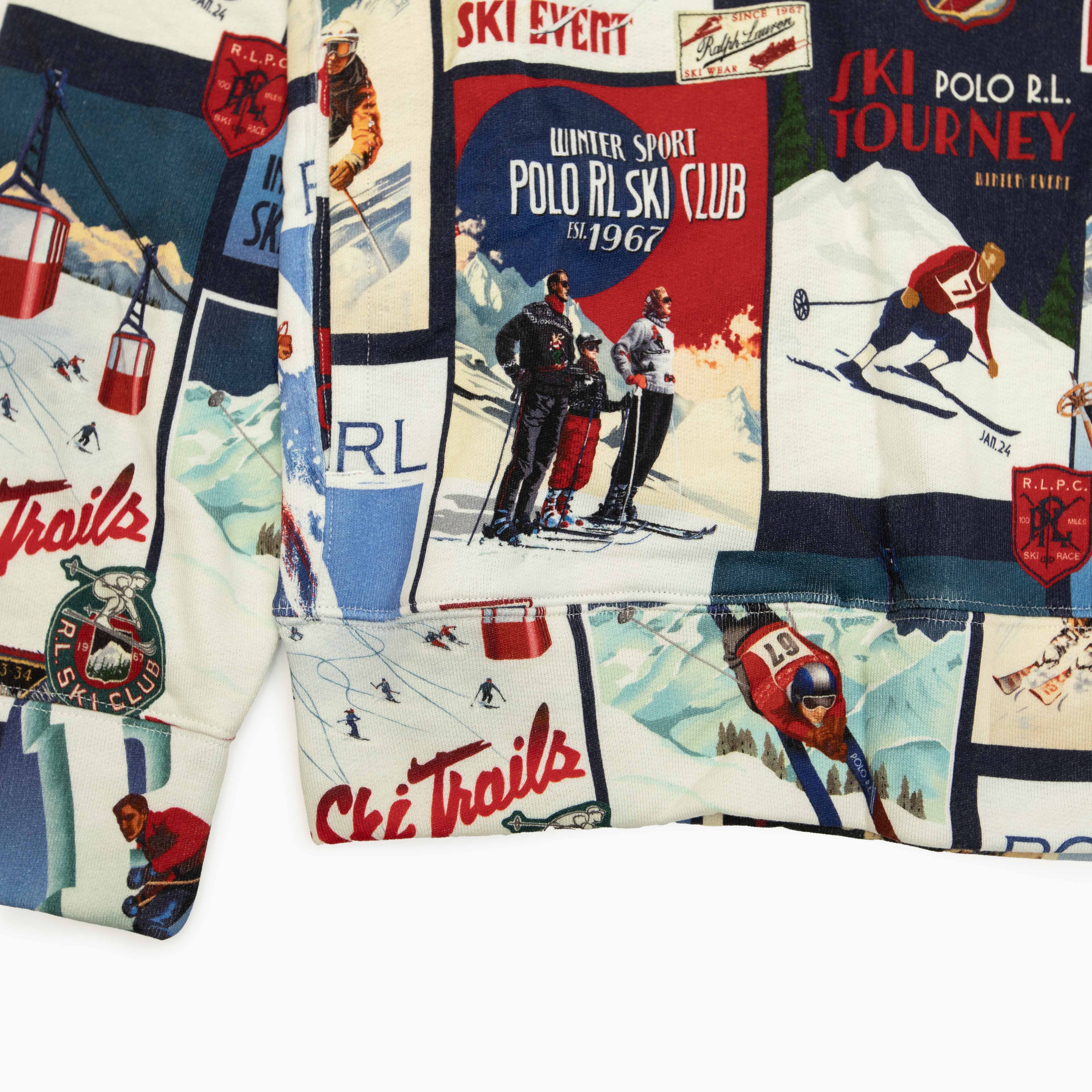 Ralph Laurenのアーカイブにあるウエスタン スキー リゾート風ポスターのようなグラフィックモチーフのパッチワークプリントが特徴のフーディ。